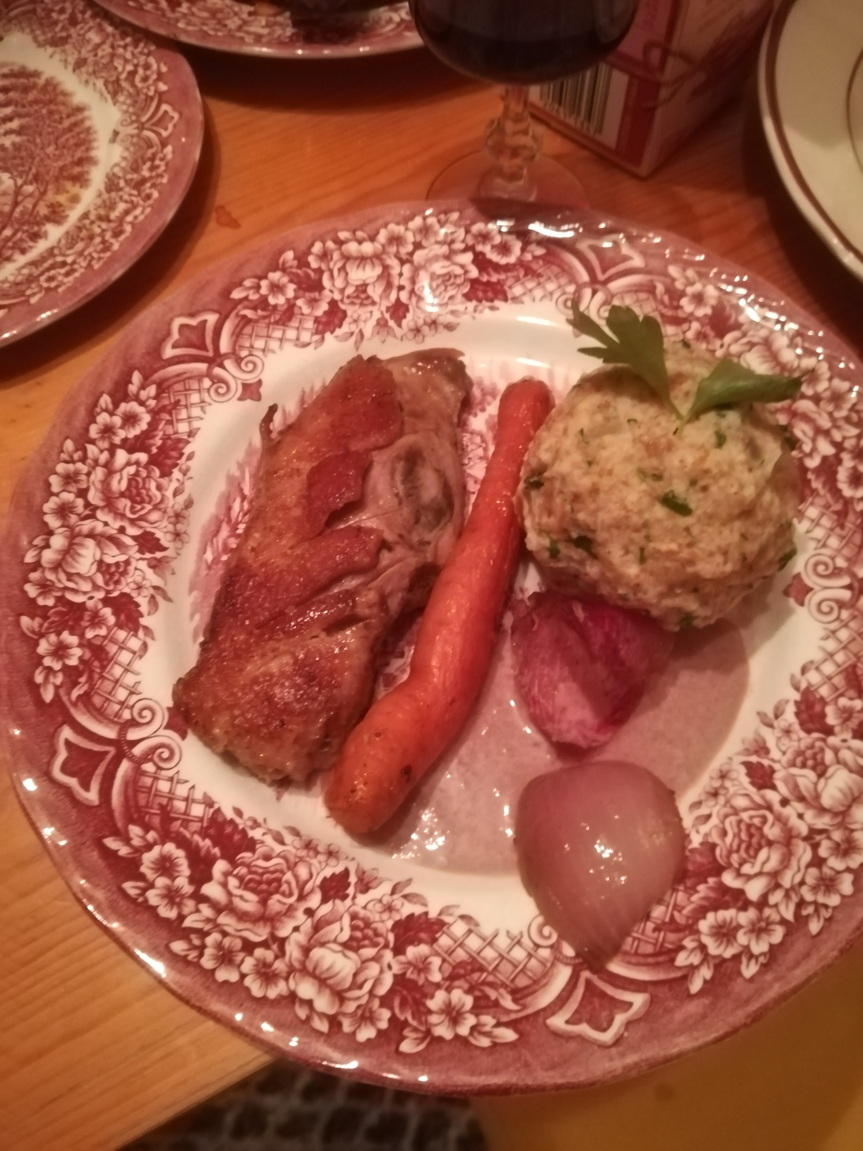 - Entenbrust mit Semmelknödl und Karotten-Charlotten-Gemüse an Apfel-Calvados-Sauce